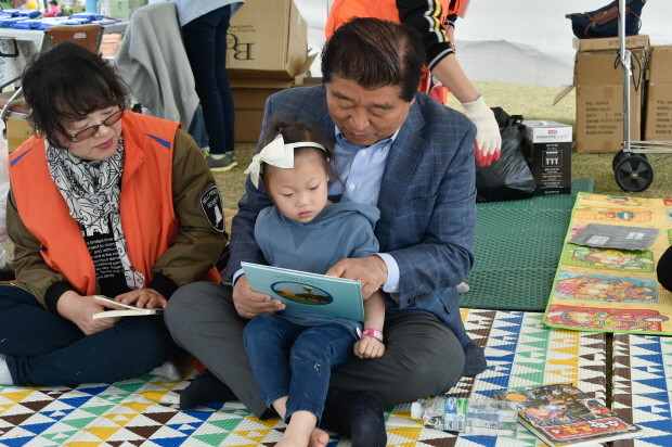 | ▲이석우 남양주시장(오른쪽)이 제22회 세계 책의 날을 맞아 22일 남양주 한강공원 삼패지구에서 어린이를 안고 책을 읽어주고 있다.<사진제공=남양주시청> |
