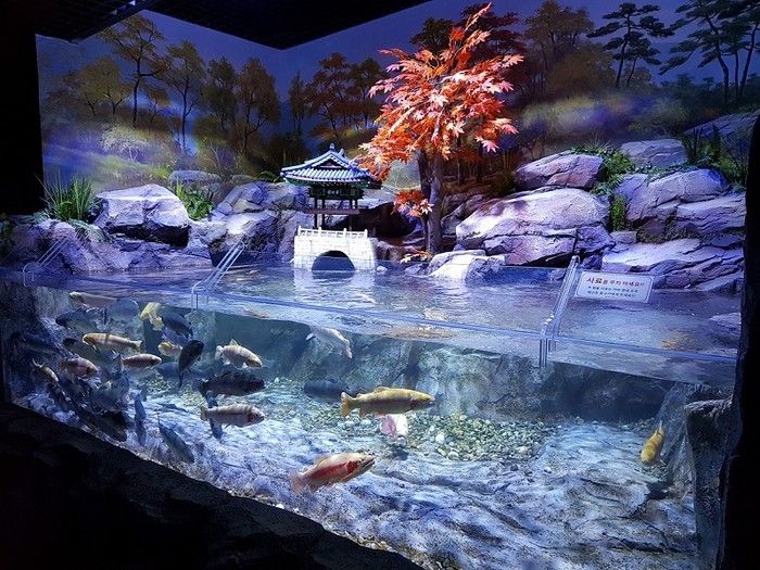 전시장 입구 대형원통수조에는 아로와나를 비롯해 레드 테일켓 피쉬, 콜로소마 등 대형 열대어 중심으로 전시했다. 대한민국 지도를 형상화한 폭포수조에선 다양한 색깔을 겸비한 아름다운 비단잉어를 볼 수 있다.