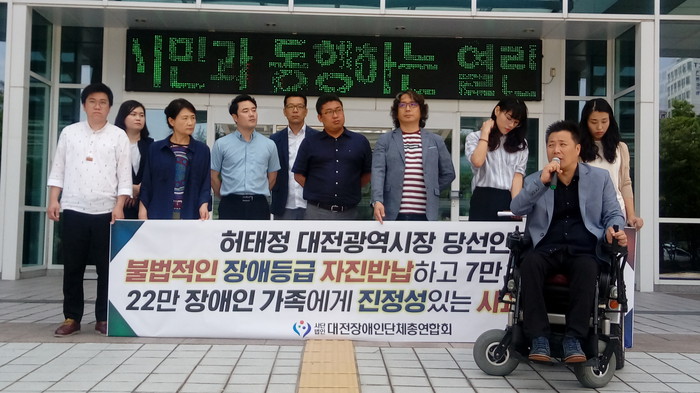 또 "선거기간 허태정 대전시장 당선인의 장애등급과 관련해 현행 장애인복지법상 맞지 않음에도 장애등급등록에 관해 '떳떳하다'는 허 당선인의 입장 보도를 접하면서 잘못된 점을 지적하지 않는다면 매우 부끄러운 일이라 생각했다"고 밝혔다.