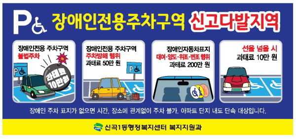 센터를 방문한 시민들이 보행로와 장애인주차구역이 인접한 공간에 주차해 장애인주차구역에 침범하는 사례가 지속적으로 발생하는 데 따른 조치다. 센터 외에도 지난 두 달간 신곡권역에서만 침범 신고가 15건에 이른다.