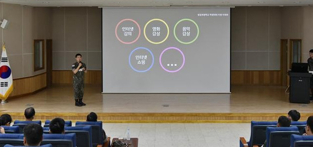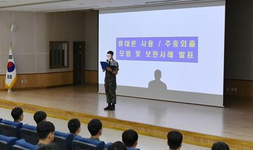 | ▲방포교 장병이 일과 후 휴대폰 사용 관련 모범 사례를 발표하고 있다. (사진=방포교 제공) |