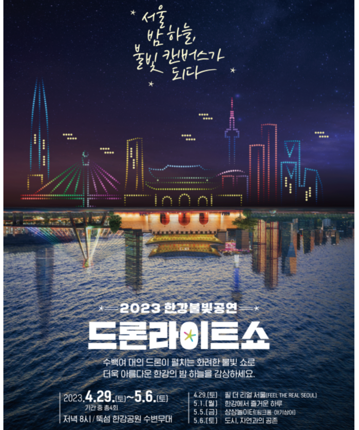 또한 사전 공연으로 ‘2023 서울거리공연 구석구석라이브’가 약 1시간 동안 펼쳐질 예정이며, 드론 라이트 쇼 종료 후에는 뚝섬한강공원의 명물인 음악분수를 볼 수 있다.
