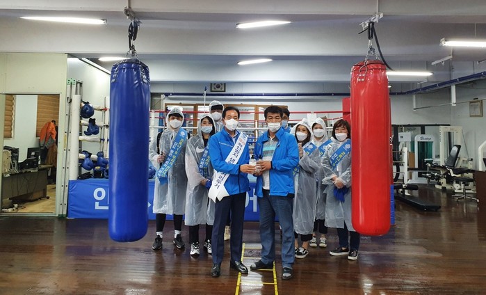 | ▲사진 위부터 박귀종(파란색 상의) 안양시체육회장이 안양시육상연맹·테니스협회 등을 방문해 손소독제를 전달하고 있다. |