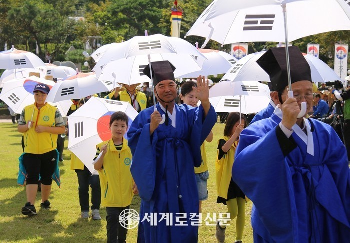 | ▲제9회 효문화뿌리축제 개막식에 선비복장을 한 어르신들과 노란 옷을 입은 아이들이 태극기 우산을 들며 입장하고 있다.<사진=라안일 기자> |