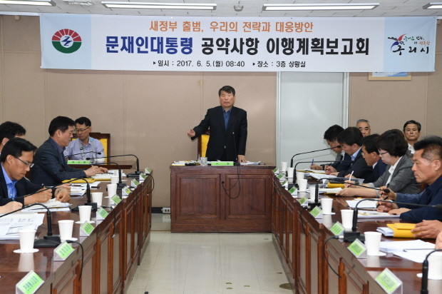 [세계로컬신문 고성철 기자] 경기도 구리시(시장 백경현)가 5일 문재인 정부의 공약사항에 대한 선제적 대응을 위한 보고회를 개최하고 새 정부의 정책방향 분석과 신속한 이행계획 수립에 나섰다.