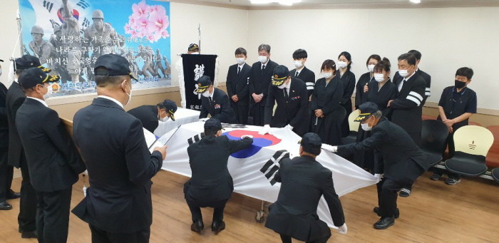 | ▲국가수훈자회 동두천시지회가 유가족이 보는 가운데 영구용 태극기 관포식을 시행하고 있다.(사진=국가유공자 동두천지회 제공) |