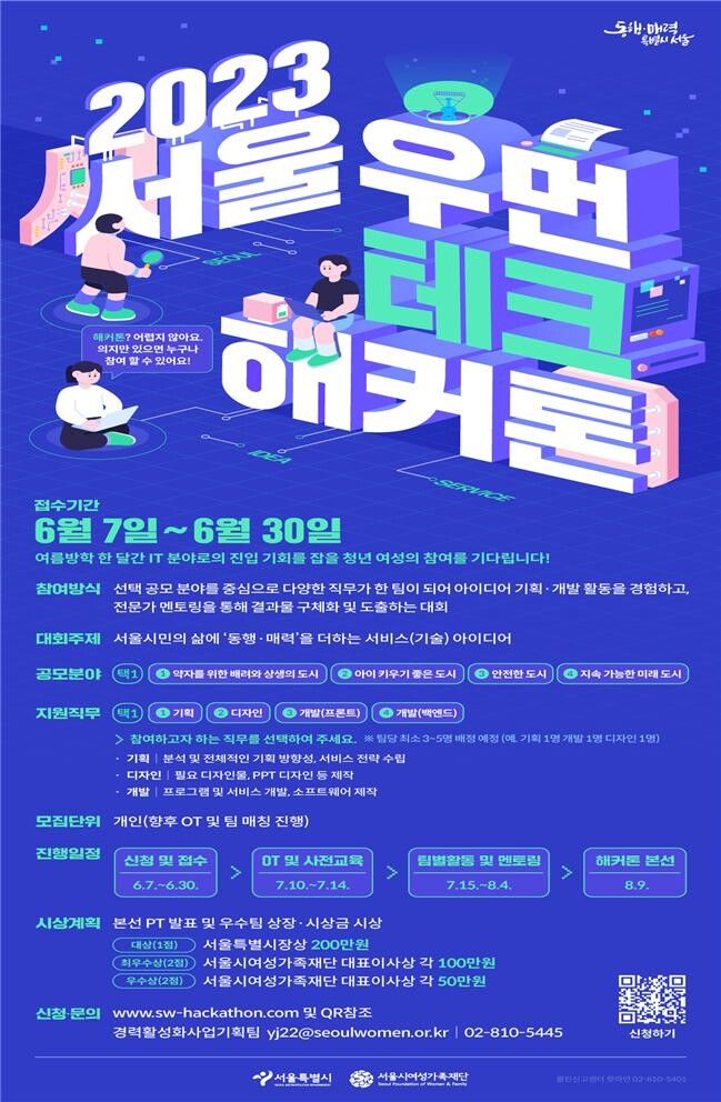 [세계로컬타임즈 이효진 기자] 서울시여성가족재단은 IT 분야에 관심 있는 청년 여성들을 대상으로 ‘동행·매력 특별시 서울’을 실현하기 위한 서비스·기술 아이디어를 모집해 발표하는 ‘2023 서울 우먼테크 해커톤’을 개최한다.