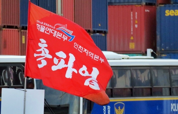 | ▲ 28일 오전 인천 연수구 인천신항 컨테이너 터미널 앞에서 화물연대 ‘총파업’ 관련 깃발이 나부끼고 있다.(사진=뉴시스) |