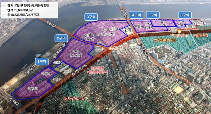 현재 압구정동에선 미성, 현대, 한양 등의 아파트 1만여 가구가 6개 구역으로 나눠 통합 재건축을 추진하고 있으며, 이 중 2~5구역이 신속통합기획에 참여했다.