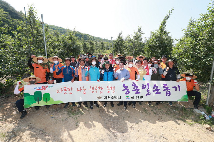 23일 보문면 사과 적과 일손돕기 현장은 재무과·농정과·축산과·보문면 직원을 비롯한 강성조 경상북도 행정부지사, 도청 예천향우회, 예천소방서 등 50여명이 참여해 일손을 보탰다.