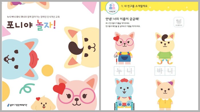 | ▲ 아동용 멀티 교육 KIT(키트) ‘포니야 놀자’ 교재 표지(좌), 교재 내용(우). (사진=용인시) |