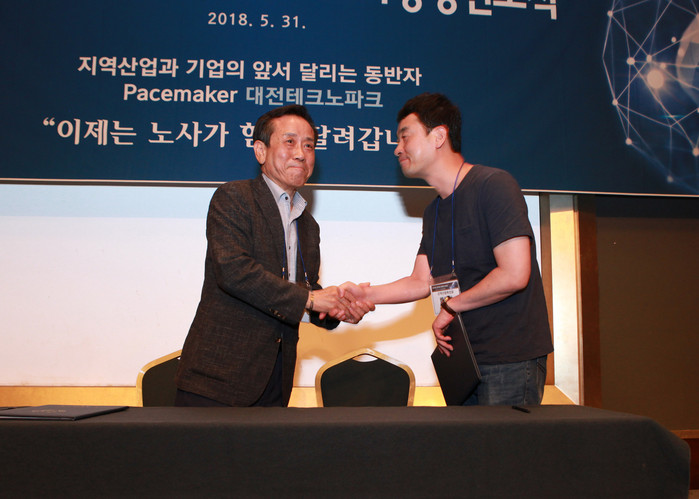 | ▲ 지난달 31일 대전테크노파크가 무주리조트에서 '2018 대전테크노파크 노사상생선포식'을 열었다. 사진은 윤석무 원장직무대행과 전국공공연구노동조합 대전테크노파크 배병준 지부장이 선포식에서 악수하고 있는 모습. |