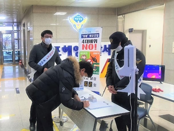 | ▲목포해경은 코로나19 및 오미크론 감염 예방을 위해 체온측정 등 방역 지침을 철저히 준수하고 있다.(사진=목포해경) |