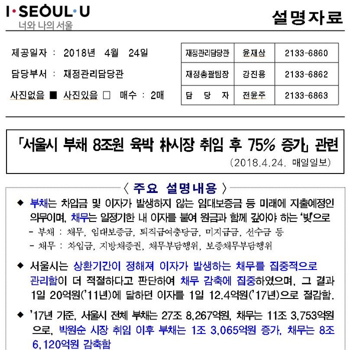 | ▲ 서울시가 발표한 '서울시 부채 8조원 육박 朴 시장 취임 후 75%증가' 관련 반박자료. <자료제공=서울시> |