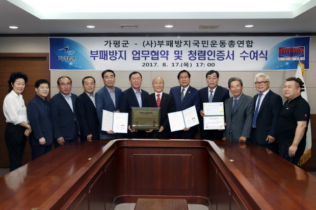 [세계로컬신문 고성철 기자] 경기도 가평군과 (사)부패방지국민운동총연합이 부패방지와 청렴 파트너로 인연을 맺었다.