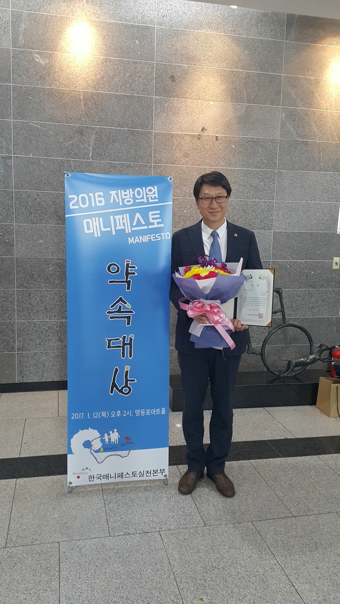 [세계로컬신문 최원만 기자] 오완석 경기도의회 의원(수원9, 더불어민주당)이 12일 한국매니페스토 실천본부 주관으로 열린 ‘2016 지방의원 매니페스토 약속대상’에서 좋은조례 부분 우수상을 수상했다.