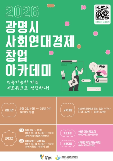 참여를 희망하는 시민이나 예비 창업자는 오는 25일까지 광명시청 누리집 공지사항에 게시된 큐알(QR)코드 또는 구글 폼에서 신청하면 된다.