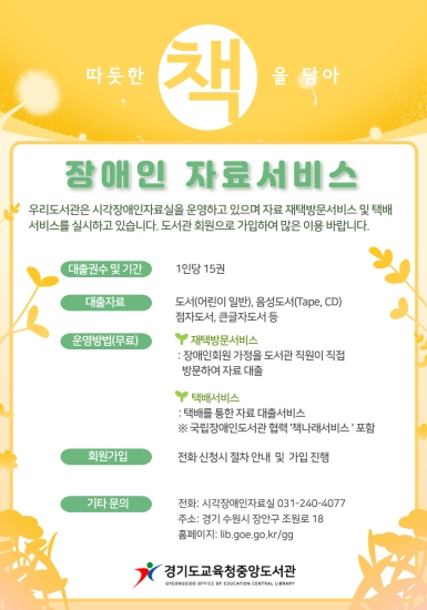 ‘장애인 자료서비스’의 이용을 위해서는 경기도교육청중앙도서관 시각장애인 자료실(031-240-4077)로 전화하면 가입과 절차를 안내받을 수 있다.