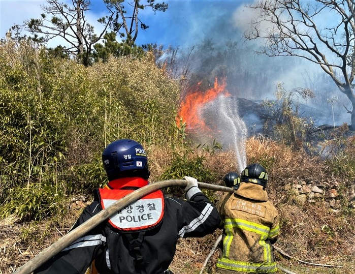 화재 현장에 도착한 해경은 자체 보유한 소화 장비를 이용해 민가 쪽으로 번지는 산불을 신속하게 진화하며 산불로 인한 큰 피해를 막았다.