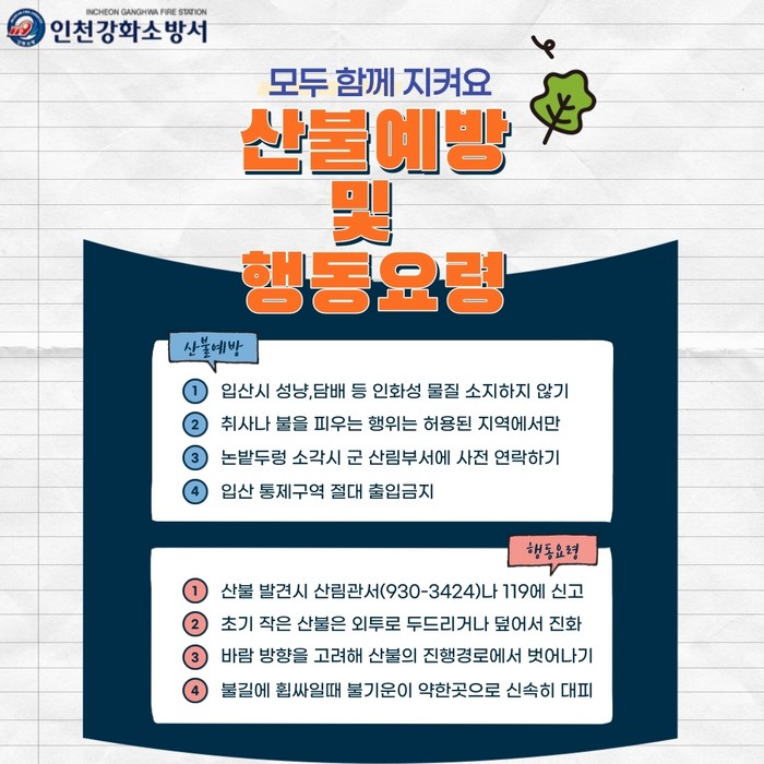 김성덕 강화소방서장은 “허가 받지 않고 산림이나 산림 인접 지역에서 불을 피운 경우 50만 원의 과태료가 부과될 수 있다”며 “시민 모두가 산불 예방에 적극적으로 협조해 주시기 바란다”고 말했다.