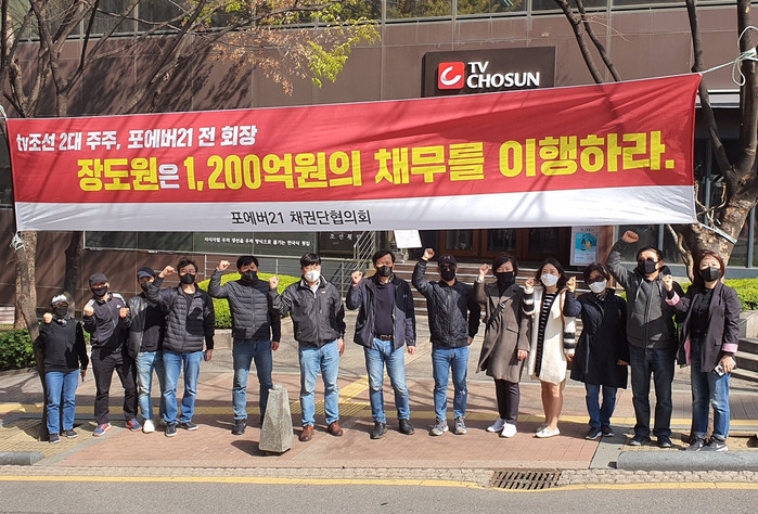 | ▲포에버21 채권단협의회는 포에버21 장도원 前 회장이 TV조선의 2대 주주로 영향력을 행사하고 있는 만큼 ‘포에버21 스캔들’에 대한 입장표명을 촉구하면서 TV조선 앞에서 시위를 벌이고 있다. (사진=채권단협의회 제공) |