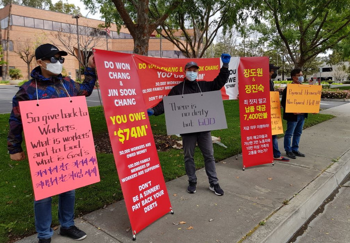 | ▲포에버21 채권단협의회는 장도원 前 회장에 대해 채무 이행 등 분명한 책임과 보상을 촉구하면서 그가 설립한 LA교회가 있는 미국 현지에서 시위를 하고 있다. (사진=채권단협의회 제공) |