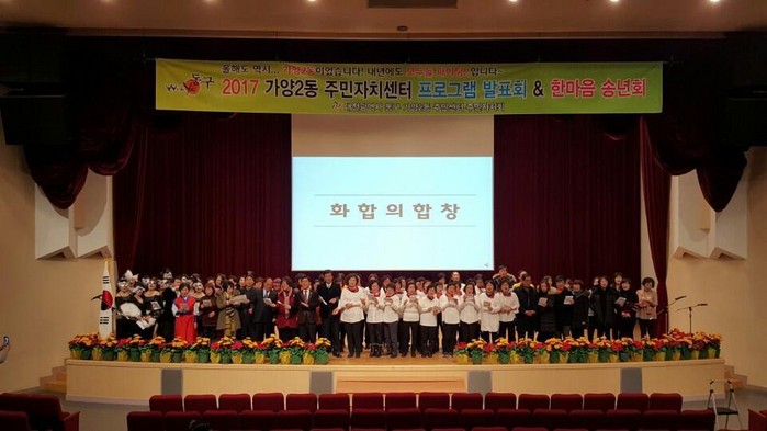 특히 마지막 순서인 ‘가양2동 화합의 합창’에서는 프로그램 회원 등 전 출연자들이 무대에 올라 함께 사랑으로(해바라기 곡)을 합창했다.