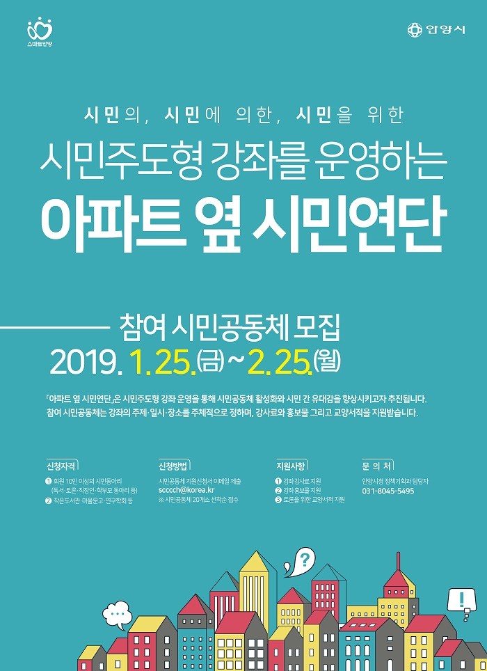 안양시는 2019년도 ‘아파트 옆 시민연단’에 참여할 시민공동체를 내달 25일까지 모집한다.