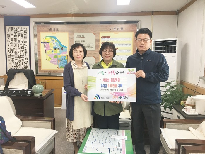 [세계로컬신문 오영균 기자] 대전시 신탄진동 새마을부녀회가 어려운 이웃돕기 기금 마련을 위해 ‘사랑의 일일찻집 수익금' 100만원을 신탄진동에 기탁했다.