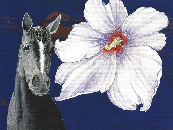 | ▲ 나라향기(무궁화, 말, 구름, 해) 60×40cm, 화선지에 혼합재료, 2007 |