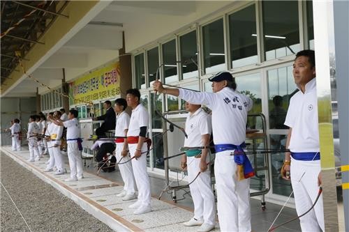 ▲ 제10회 보성군수기 전국남녀 궁도대회에 참가한 선수들이 벌교읍 관덕정에서 국궁을 쏘고 있다. <사진제공=보성군청> |