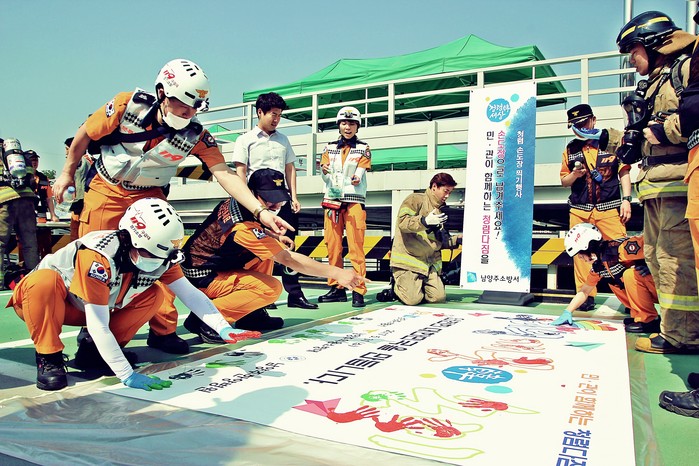 | ▲ 지난달 31일 남양주한양병원에서 긴급구조종합훈련을 실시한 후 소방공무원과 의용소방대원, 유관기관‧단체, 한양병원 등 100여 명이 참여한 가운데 청렴다짐 손도장 찍기 행사를 벌이고 있다.<사진제공=남양주소방서> |