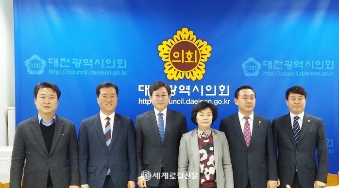 | ▲ 김경훈 대전시의장(왼쪽 세번째)은 상임위원장들과 함께 26일 시의회 기자실에서 기자간담회를 갖고 있다. |
