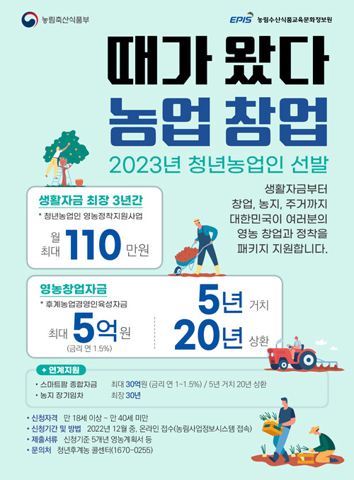 한편, 후계농업경영인은 시행연도 기준 만 18세 이상 50세 미만, 영농경력 10년 이하의 농업인을 대상으로 평가 및 심의를 거쳐 선정되며 선정 시 최대 5억 원 한도, 5년 거치 20년 분할상환, 연리 1.5%의 융자 조건으로 농지구입, 시설설치 등을 위한 후계농 육성자금을 지원한다.