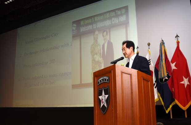안병용 시장은 미2사단의 요청으로 이뤄진 이날 연설에서 의정부시 현황을 설명하고 현재까지 진행 중인 미2사단과의 교류사업 사례들을 소개하며 미2사단 본부가 위치한 의정부시가 경기 북부의 안보 중심지로 미군부대와 50여년의 역사를 함께 해 왔다는 점을 강조했다.