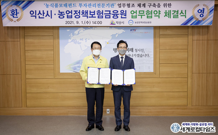 [세계로컬타임즈 조주연 기자] 전북 익산시가 농업정책보험금융원과 농식품산업의 투자 촉진 및 농식품경영체 육성 지원을 위한 업무협약을 맺었다.