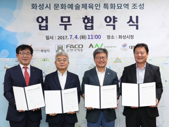 화성시는 4일 시청 접견실에서 한국예술인복지재단, 대한체육회, 한국예술문화단체총연합회와‘문화예술체육인 특화묘역 조성을 위한 업무협약’을 체결했다.