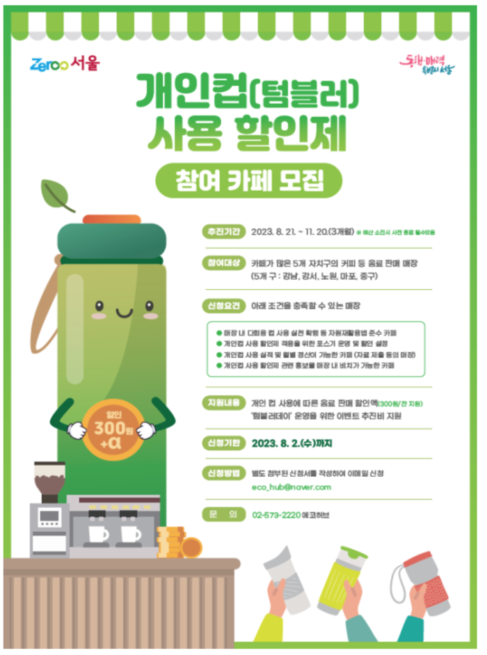 참여를 희망하는 매장은 서울시 개인컵 사용 추가 할인제 보조사업자인 에코허브 온라인 카페 및 서울시 누리집에서 공고문을 확인하고 8월 2일까지 전자우편으로 신청서를 제출하면 된다.