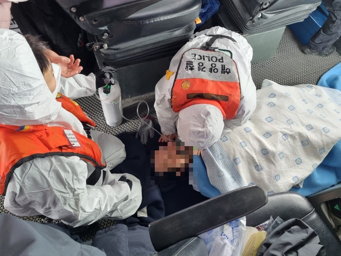 | ▲목포해경이 환자에게 산소호흡기를 이용해 응급처치를 실시하고 있다.(사진=목포해경) |
