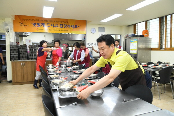 [세계로컬신문 고성철 기자] 안승남 경기도 구리시장은 30일 인창경로식당에서 민족통일 구리시협의회(회장 최경만) 회원 24여명과 함께 어르신들에게 삼계탕 225그릇과 수박을 대접하는 급식 봉사 활동을 펼쳤다.