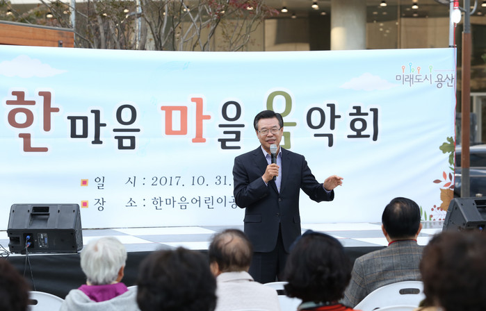| ▲ 성장현 구청장이 열린 마을음악회에서 주민들에게 인사말을 하고 있다. (사진= 용산구청 제공) |