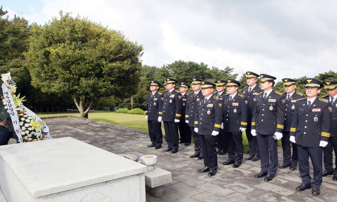 [세계로컬신문 김영주 기자] 이상정 제주지방경찰청장이 20일 오전 차장과 각 과장‧담당관, 동‧서부서장 등과 함께 제72주년 경찰의 날을 맞아 제주시 충혼묘지에서 충혼탑·경찰묘역을 참배하고 있다. 이날 이상정 청장은 순국선열과 호국영령의 명복을 빌고, 숭고한 호국정신의 위훈을 기렸다.<사진제공=제주지방경찰청>