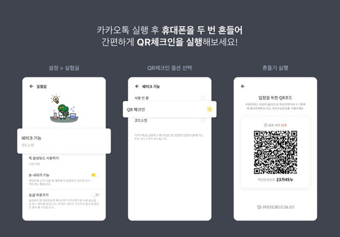카카오는 카카오톡 실행 후 휴대폰을 두 번 흔드는 간편한 절차만으로 QR체크인을 할 수 있는 쉐이크 기능을 추가했다고 9일 밝혔다.