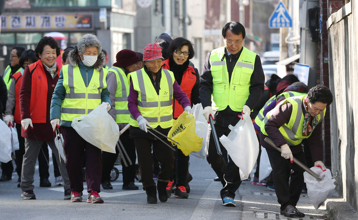 | ▲ 대전 동구가 29일 2018 평창 동계올림픽 성화봉송 행사에 앞서 자양동 일원에서 일제 대청소의 날을 개최하고 있다. |