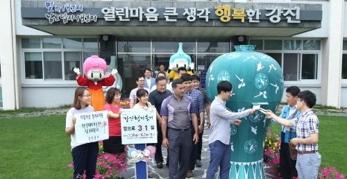 ▲ 제44회 강진청자축제가 한달 앞으로 다가온 가운데 29일 전남 강진군청 정문 앞에서 지난해 축제장에서 운영한 타임머신 청자우체통 엽서를 발송하는 행사를 진행하고 있다. <사진제공= 강진군청> |