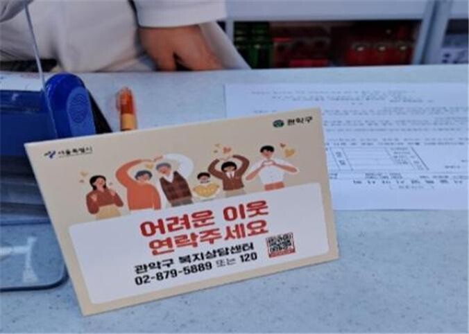 | ▲ 약국 카운터에 비치된 복지 상담 안내보드 (사진=서울시) |
