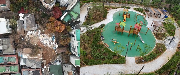 | ▲비둘기어린이공원 조성전(왼쪽)과 조성후 모습. (사진=동작구 제공) |