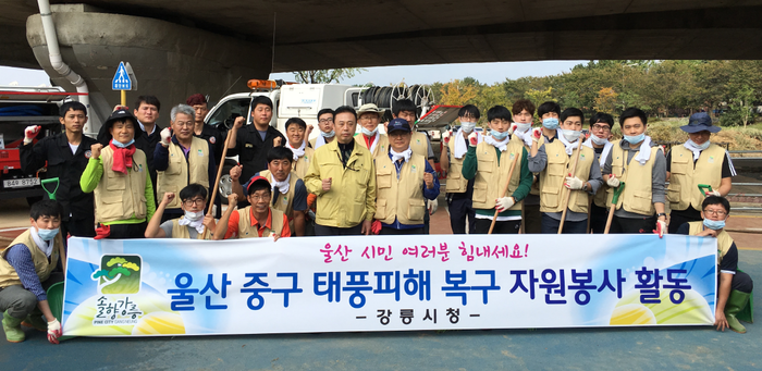 강릉시 피해복구지원단은 울산시 중구 태화강 주변 강변도로, 체육공원 등에서 대형폐기물들을 거둬내고 물청소 등 환경정화 봉사활동을 펼쳤다.