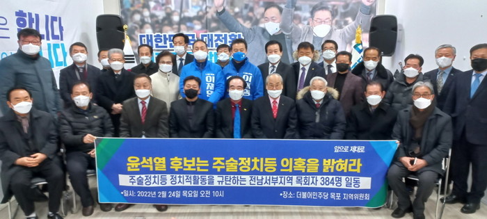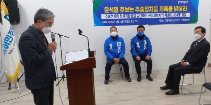 | ▲주술정치 등 규탄하는 전남서부지역 목회자 384명 성명 발표(사진=더불어민주당 목포지역위원회) |