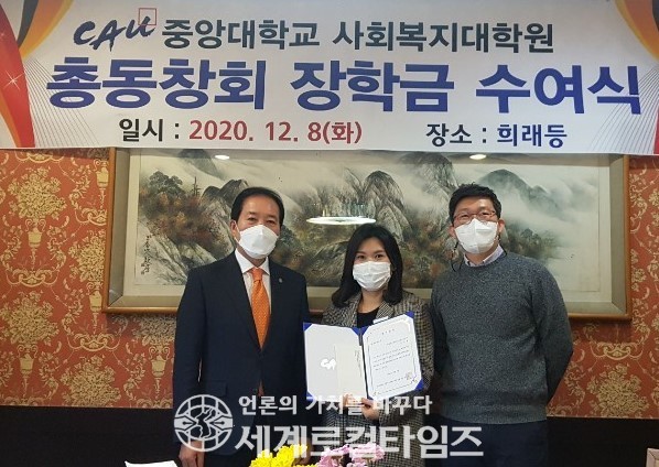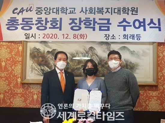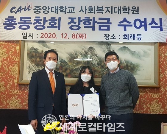 | ▲박귀종 중앙대학교 사회복지대학원 총동창회장(사진 왼쪽)이 장학금을 수여한 뒤 기념촬영을 하고 있다. |